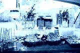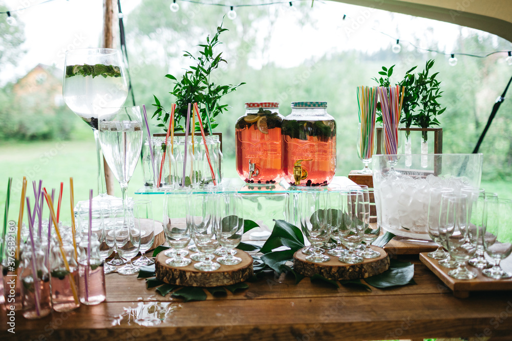 Front view of drink bar on formal occasion. Empty glasses on wooden table. Preparing for big gala night, prom, birthday celebration with alcohol free cocktails. Concept of sober party for adults.