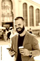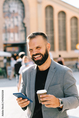 adult man with beard and casual grey suit using mobile and drinking coffee