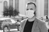 adult man in grey casual suit with mask and social distance - coronavirus concept