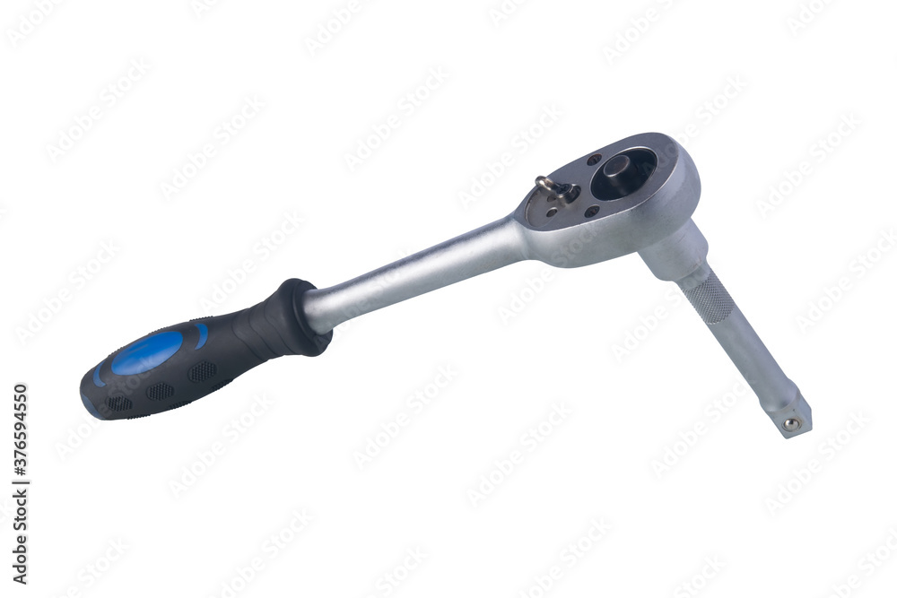 key adapter, ratchet, metal with black handle, for quick unscrewing of bolts and nuts, on a white background