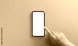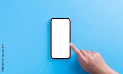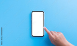 hand touching on phone white screen on blue background clipping path inside