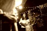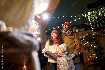 family, winter holidays and celebration concept - happy mother, father and little daughter at christmas market on town hall square in tallinn, estonia