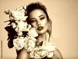 Attractive brunette girl with big beautiful bouquet of flowers. Beautiful white girl with flowers. Pretty woman with bright makeup. Art portrait with flowers.