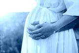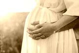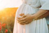 Cropped image of beautiful pregnant woman and her husband hugging belly on poppies field background in summer sunny day. Summer landscape.