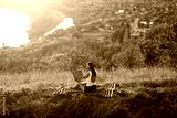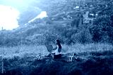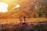 Pretty young woman sitting on green grass on the hill during sunny summer day, while using laptop and wireless earphones for video call.
