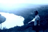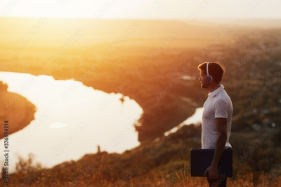 Young hipster man with headphones standing on top of the hill with laptop in hand over river background in orange sunset.