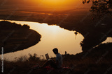 Silhouette of man working on laptop, he sitting on the peak of a mountain at sunset with river on background. Technology, internet, staying online in nature.