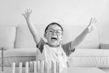Happy smart and nerd toddler asian boy raised hand when he win play wooden toy block at home.Boy child kid wearing glasses.myopia or Short sighted.Positive human emotion, Attitude and self esteem.