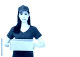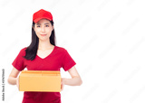 Delivery woker in red uniform isolated on white background, copy space. Woman in cap, t-shirt working as courier or dealer holding parcel box. Receiving package. delivery service and shipment concept