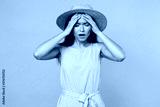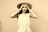 Frustrated sick tired young brunette woman 20s in pink summer dotted dress hat posing put hand on head having headache keeping eyes closed isolated on pastel pink color background studio portrait.