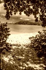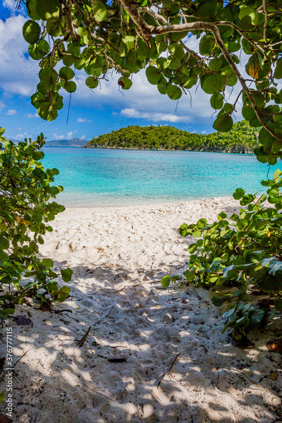 Grape leave branches create an entrance on to Hawksnest Beach on St John
