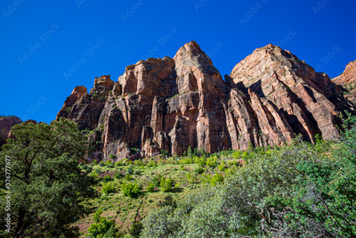 High dramatic mountain structures seen on each side o Mt. Carmel highway in Zion