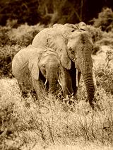 Mother and young juvenile elephant walk together through tall grass in Kenya