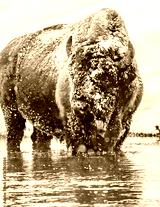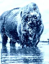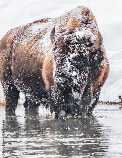 Snow covered buffalo looking left in Yellowstone in Wintrer