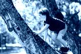 childhood, leisure games and people concept - happy little boy climbing tree at summer park