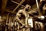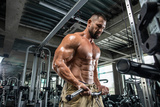 Attractive tall muscular bodybuilder doing heavy deadlifts in moder fitness center.