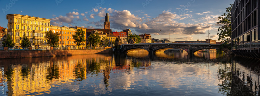 Panorama of the historic district of Wrocław seen from the water in the golden hour