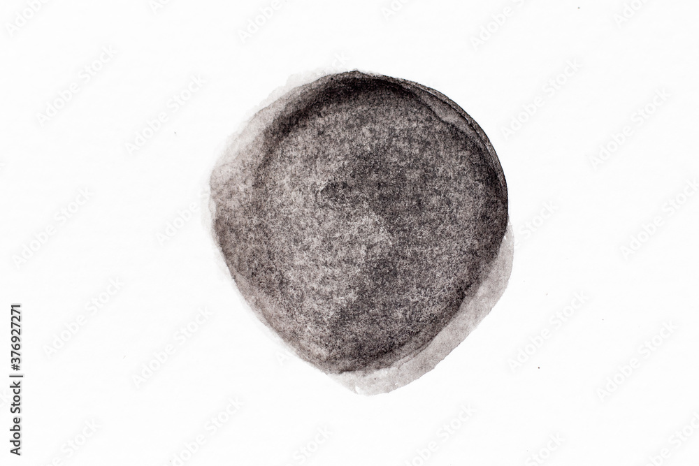 Black color watercolor drawing in round brush or banner shape on white paper background