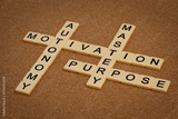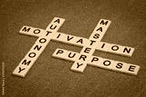 three elements of true motivation - mastery, autonomy, purpose - crossword with ivory letter blocks on cork board, personal development concept