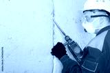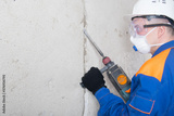 a worker in protective clothing, a mask and a helmet, works on dismantling the concrete wall , hammer