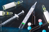 against the background of a photograph of a person with suspected coronavirus, a syringe with a preparation, tablets, ampoules, a thermometer for measuring body temperature, close-up