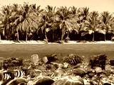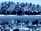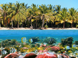 Over and under water surface near a beach with coconut trees and a coral reef with tropical fish, Caribbean sea