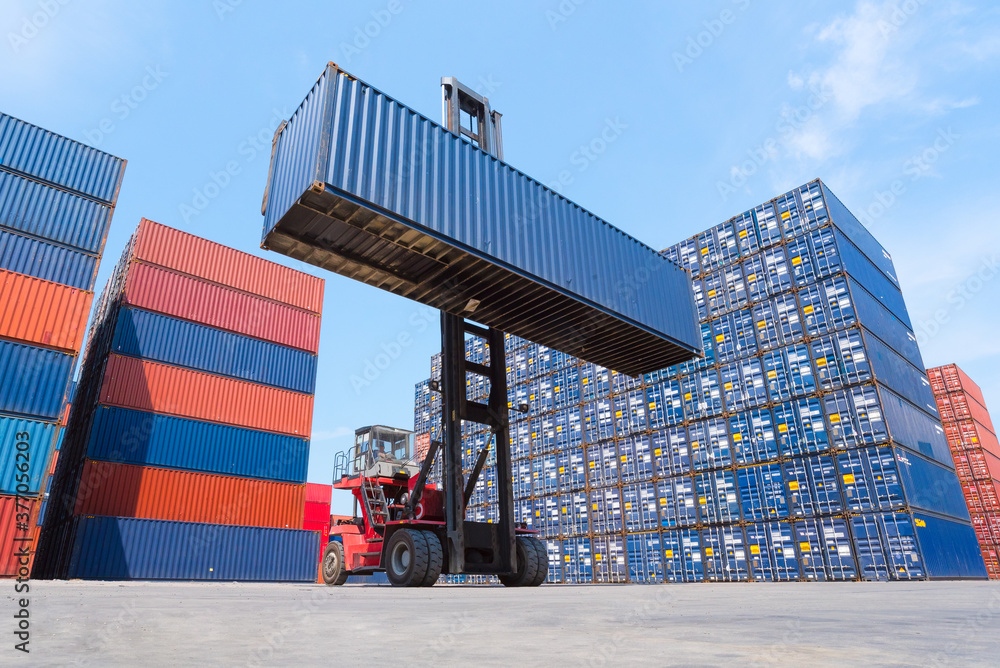 Forklift truck lifting cargo container in shipping yard or dock yard for logistic industry