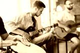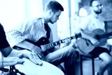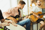 Songs. Musician band jamming together in art workplace with instruments. Caucasian men and women, musicians, playing and singing together. Concept of music, hobby, emotions, art occupation.