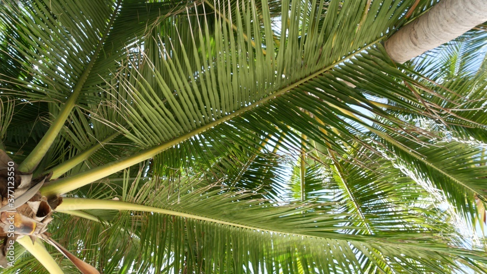 Coconut palm trees crowns against blue sunny sky perspective view from the ground. Tropical travel background landscape at paradise coast. Summer beach nature scene with green leaves sway in the wind