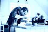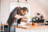 attractive nerd guy with glasses in stylish kitchen follows a recipe on the phone prepares chicken