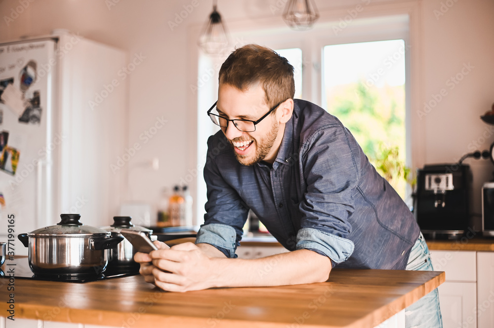 attractive nerd guy with glasses in stylish kitchen follows a recipe or reads news on the phone