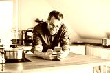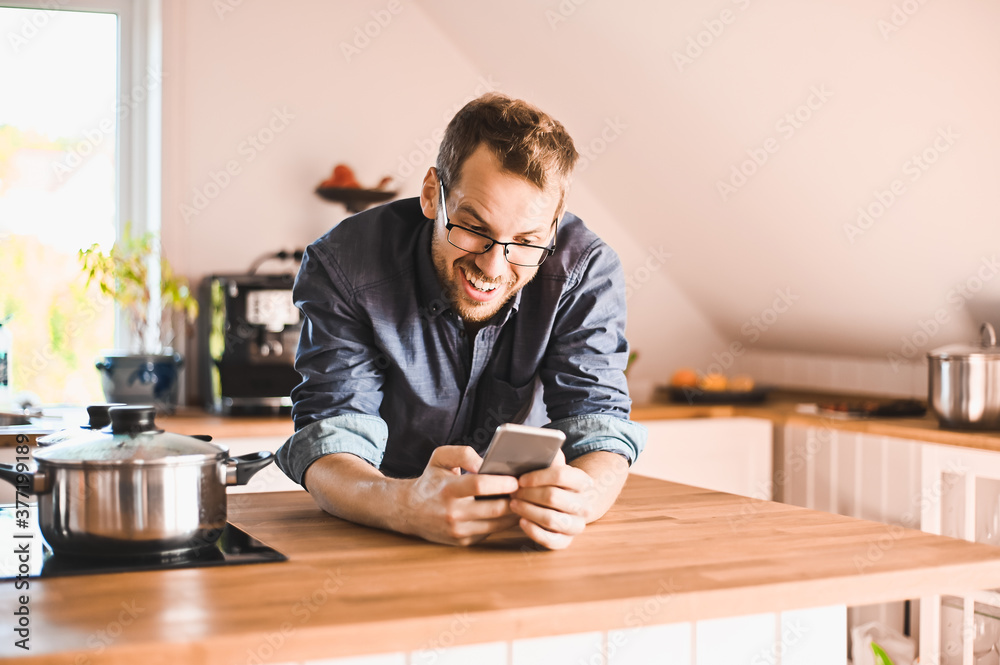 attractive nerd guy with glasses in stylish kitchen follows a recipe or reads news on the phone