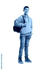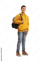 Male teenage student in a yellow hoodie and a backpack smiling at the camera