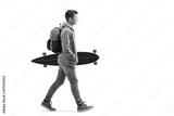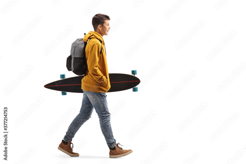 Male teenage student in a yellow hoodie walking and holding a longboard