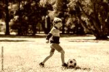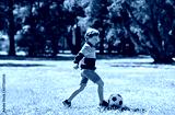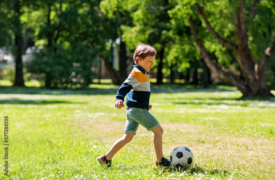 childhood, leisure games and people concept - happy little boy with ball playing soccer at summer park