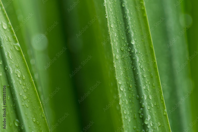 Selective focus fresh green leaves with raindrop. Water drops or rain drop on green plant leaves in garden. Nature background. Rainy season. Green leaf texture background with minimal pattern for spa.