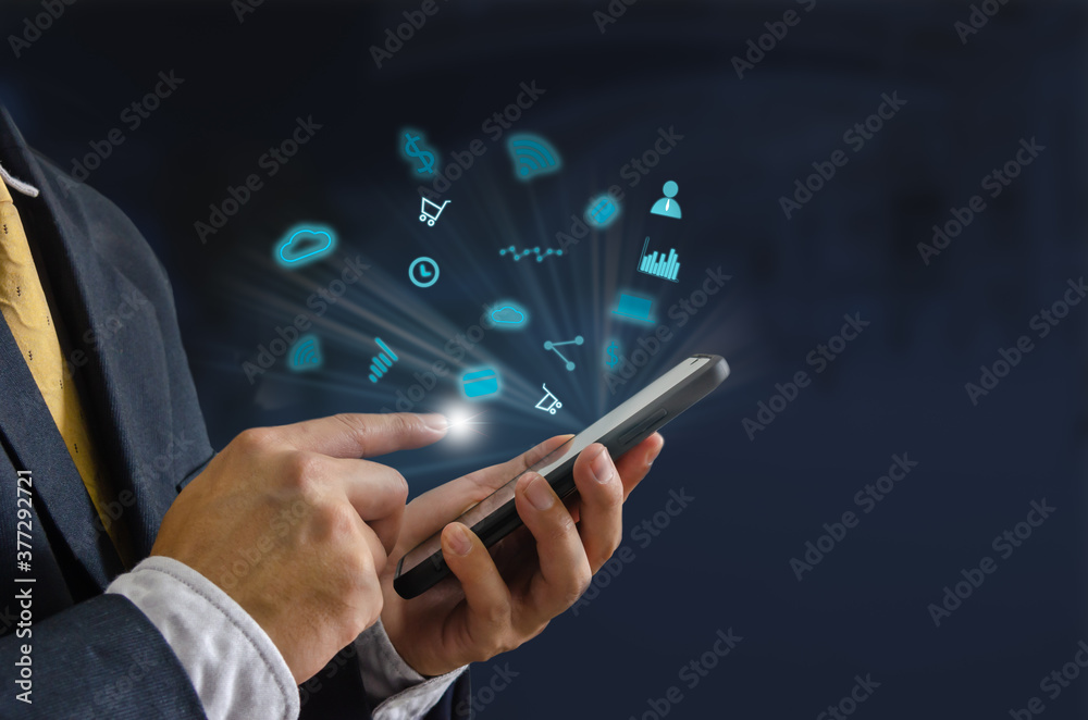 Hand holding smartphone with icons concept.