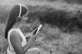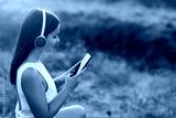 Young girl with headphones listening the music from her smart phone on the hill during at sunset.