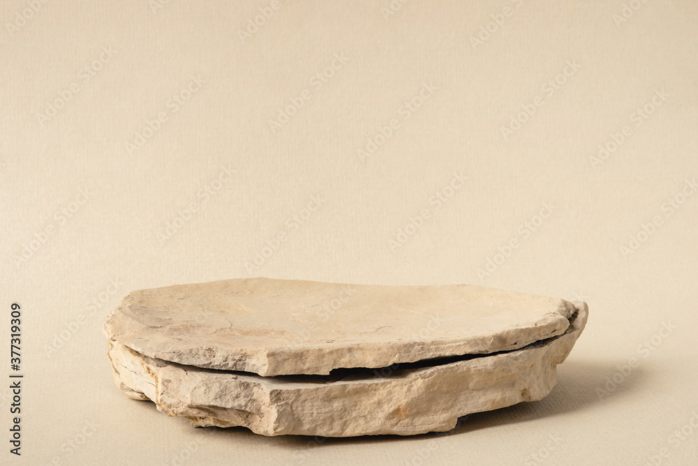 Background for cosmetic products of natural beige color. Stone podium on a white background. Front view.