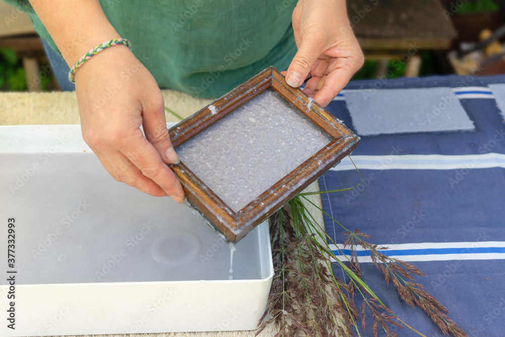 Woman holding frame for making paper sheets from waste paper pulp. Selective focus. Decorative and applied art. Recycling concept, ecology.