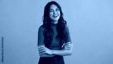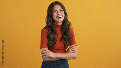 Beautiful smiling girl in red top with hands crossed happily laughing on camera over colorful background