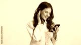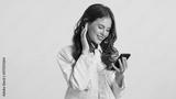 Beautiful casual girl dreamily listening music in earphones on smartphone over white background