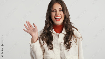 Beautiful cheerful girl happily waving hello over white background. Greeting expression