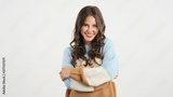 Beautiful smiling girl in cozy sweater happily looking in camera over white background. Cute expression