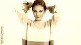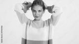 Beautiful girl in cozy sweater tying her hair intently looking in camera over white background