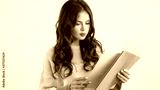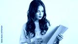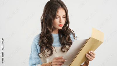 Attractive serious girl in sweater opening envelope intently looking exam results over white background