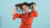 Pretty smiling girl in red dress playing with hair happily looking in camera over colorful background