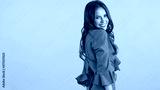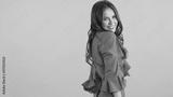 Gorgeous romantic girl in red dress happily looking in camera over colorful background