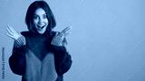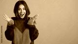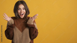 Attractive surprised girl in cozy knitted sweater amazedly looking in camera over colorful background. Wow expression
