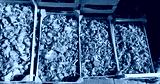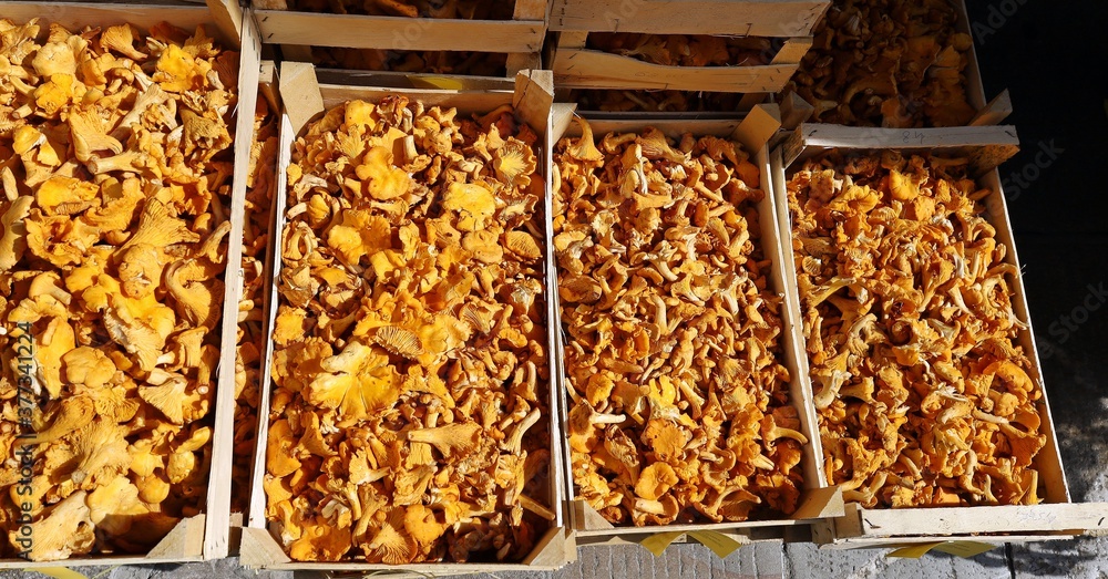 Wooden crates full of freshly picked yellow chanterelle mushrooms. Top view.